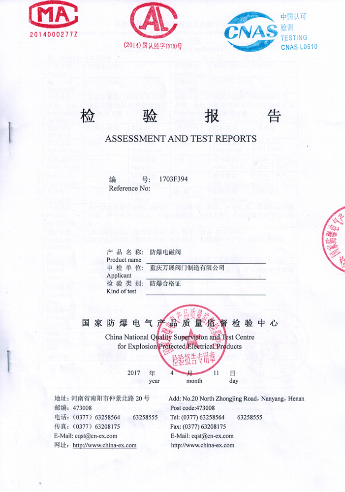 我司获得的防爆电磁阀合格证标志为"ExdⅠ/ⅡCT5","Ex"为通用符号,表示explosive,"d"表示次防爆型式为"隔爆型d"."Ⅰ"或"Ⅱ"表示电气设备分类,Ⅰ为煤矿用电气设备,Ⅱ为除煤矿外其它爆炸性气体环境用设备.其中,Ⅱ类隔爆型"d”电气设备又分为ⅡA,ⅡB和ⅡC类."T5"表示温度组别。此等级属国内电磁阀的高等级,象征我司的防爆电磁阀已达到国内外高级水平,欢迎新老客户订购。
